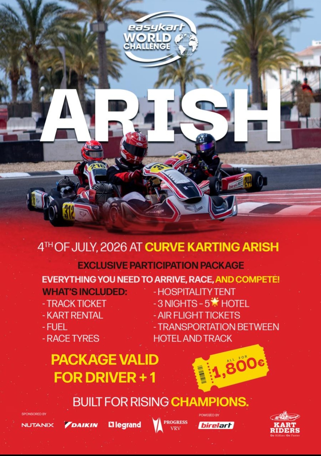 Il pacchetto include ticket pista, noleggio kart, carburante, pneumatici da gara, hospitality tent, tre notti in hotel cinque stelle, voli aerei e trasporto tra hotel e circuito. (valido per n. 1 pilota + n. 1 accompagnatore/meccanico).